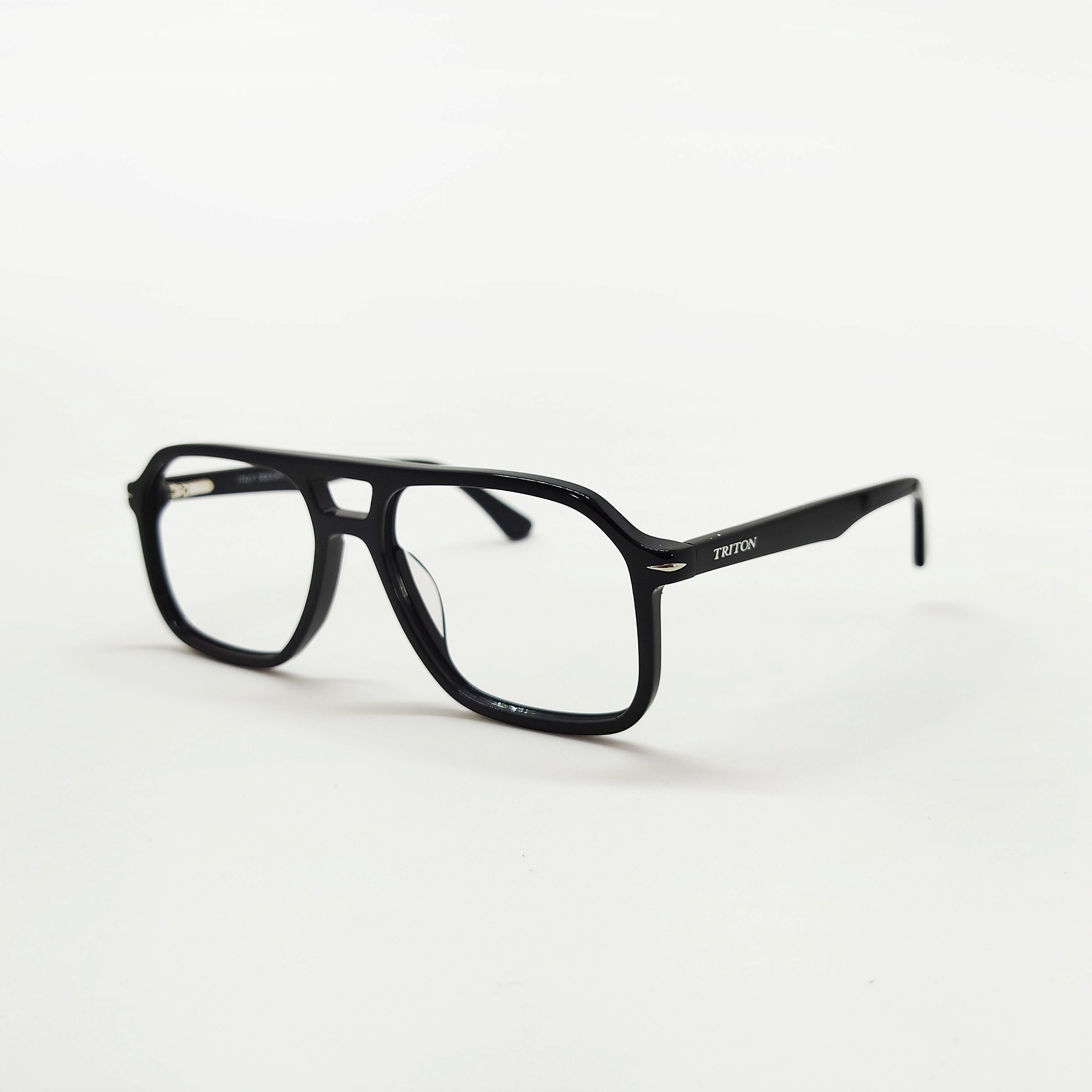 Óculos de grau Triton, formato aviador na cor preta. Armação em acetato, material leve e resistente, proporcionando maior conforto ao usar. As plaquetas são embutidas, deixando o visual moderno.