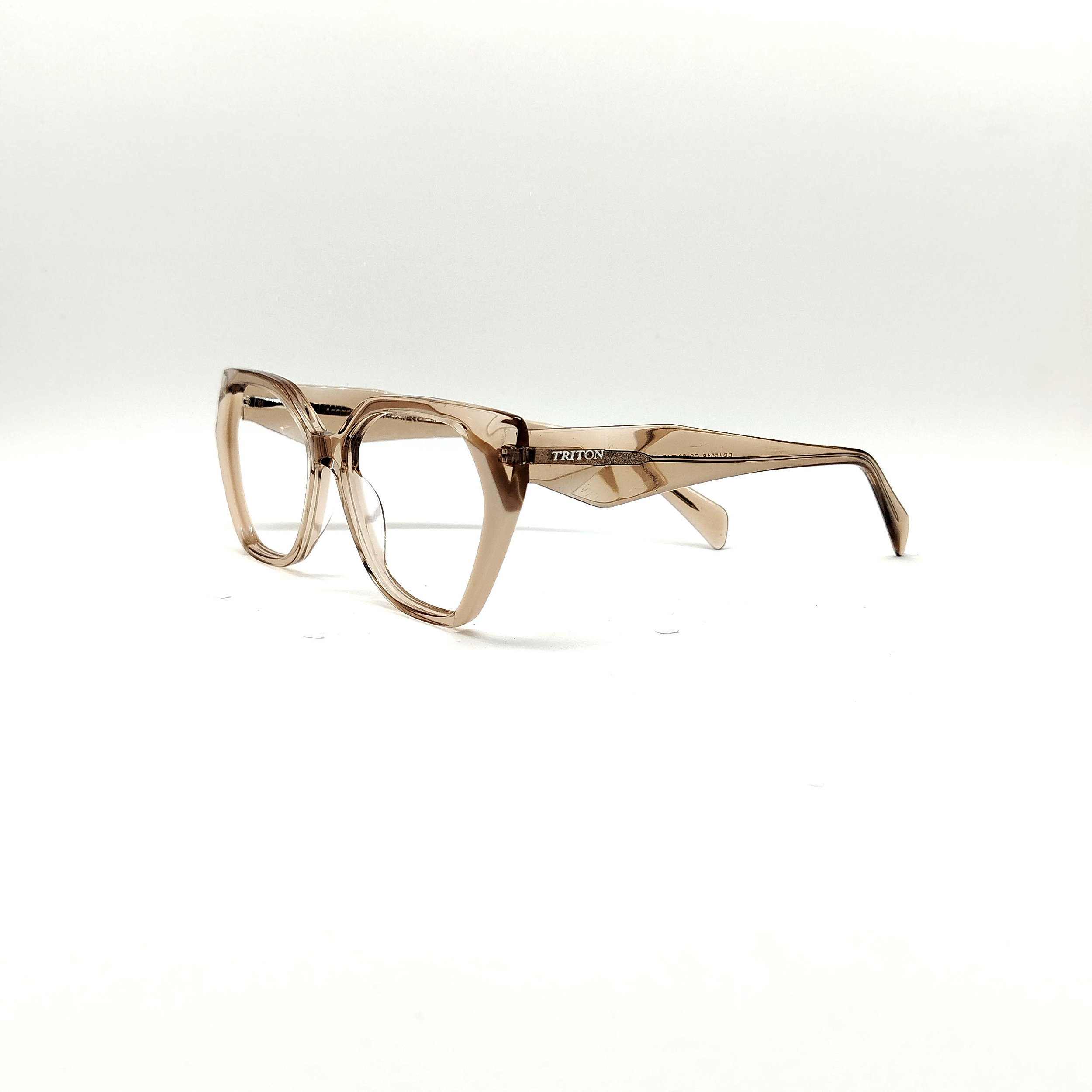 Óculos de grau Triton, formato gatinho na cor bege. Armação em acetato, material leve e resistente, proporcionando maior conforto ao usar. As plaquetas são embutidas, deixando o visual moderno.