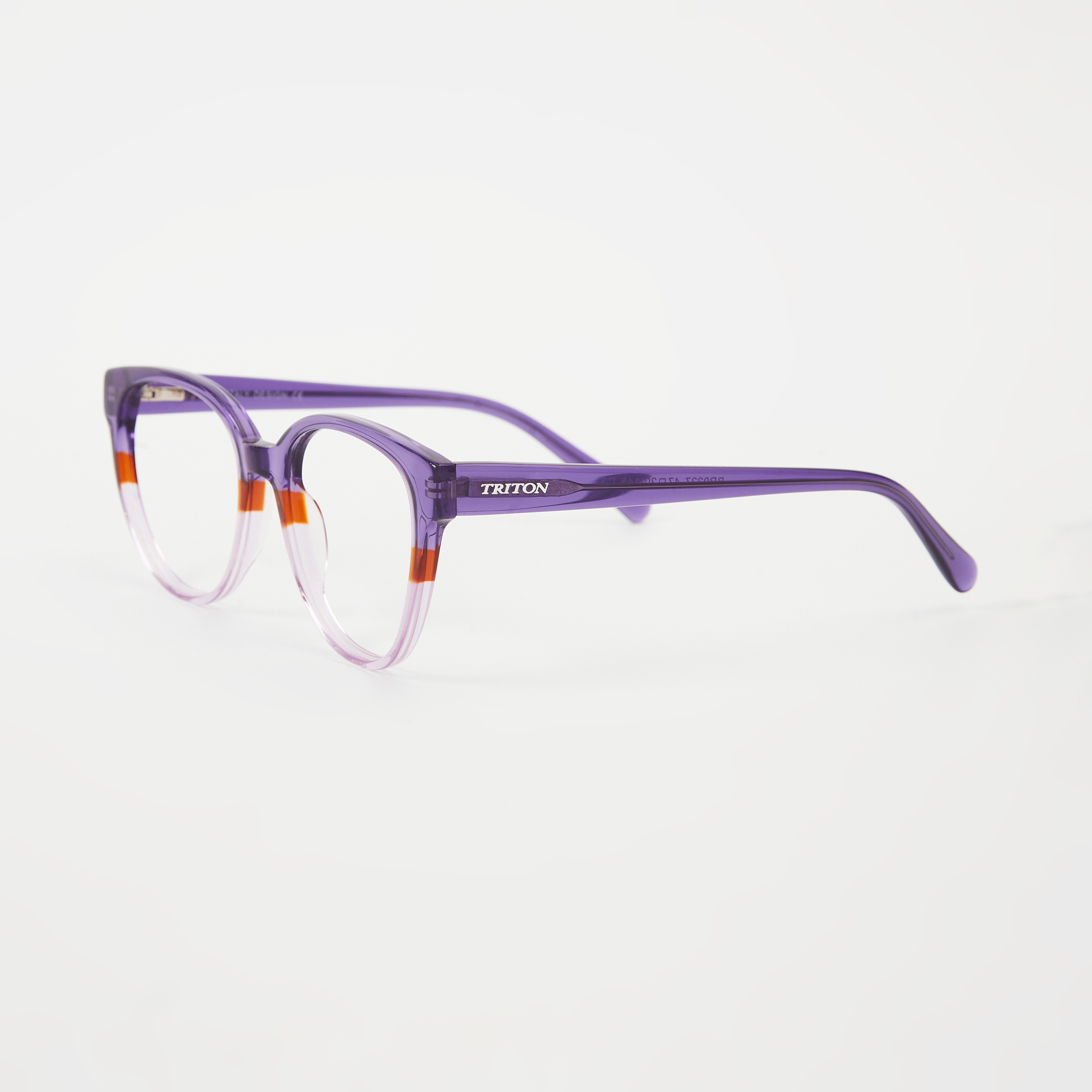 Óculos de grau Triton, formato gatinho na cor lilás com detalhe em vermelho e rosa transparente. Armação em acetato, material leve e resistente, proporcionando maior conforto ao usar. As plaquetas são embutidas, deixando o visual moderno.