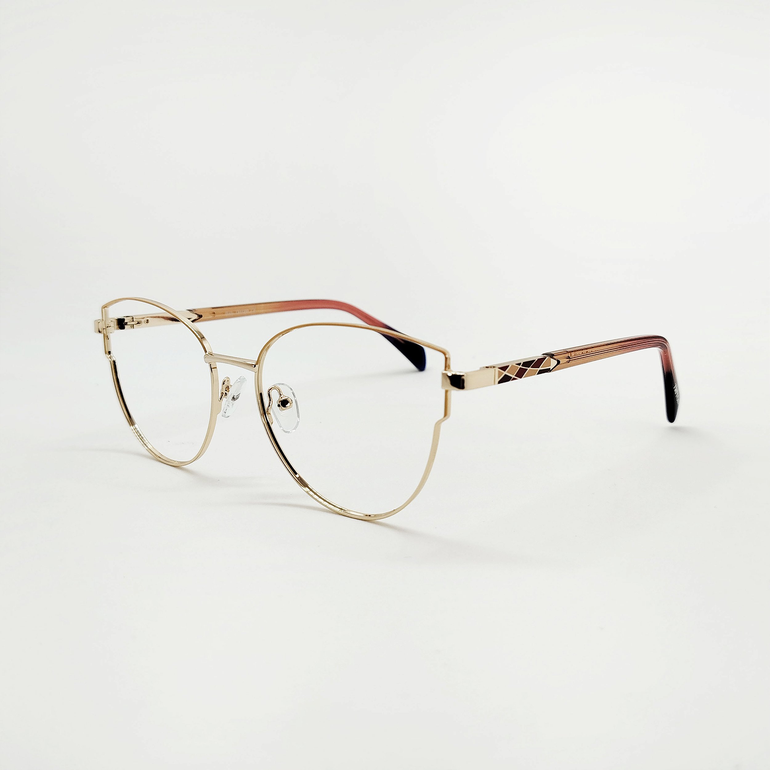 Óculos de grau Triton, formato gatinho na cor dourada. Armação em metal, material leve e resistente, proporcionando maior conforto ao usar. As plaquetas em silicone flexíveis podem se ajustar manualmente a diferentes tamanhos e formatos de nariz.