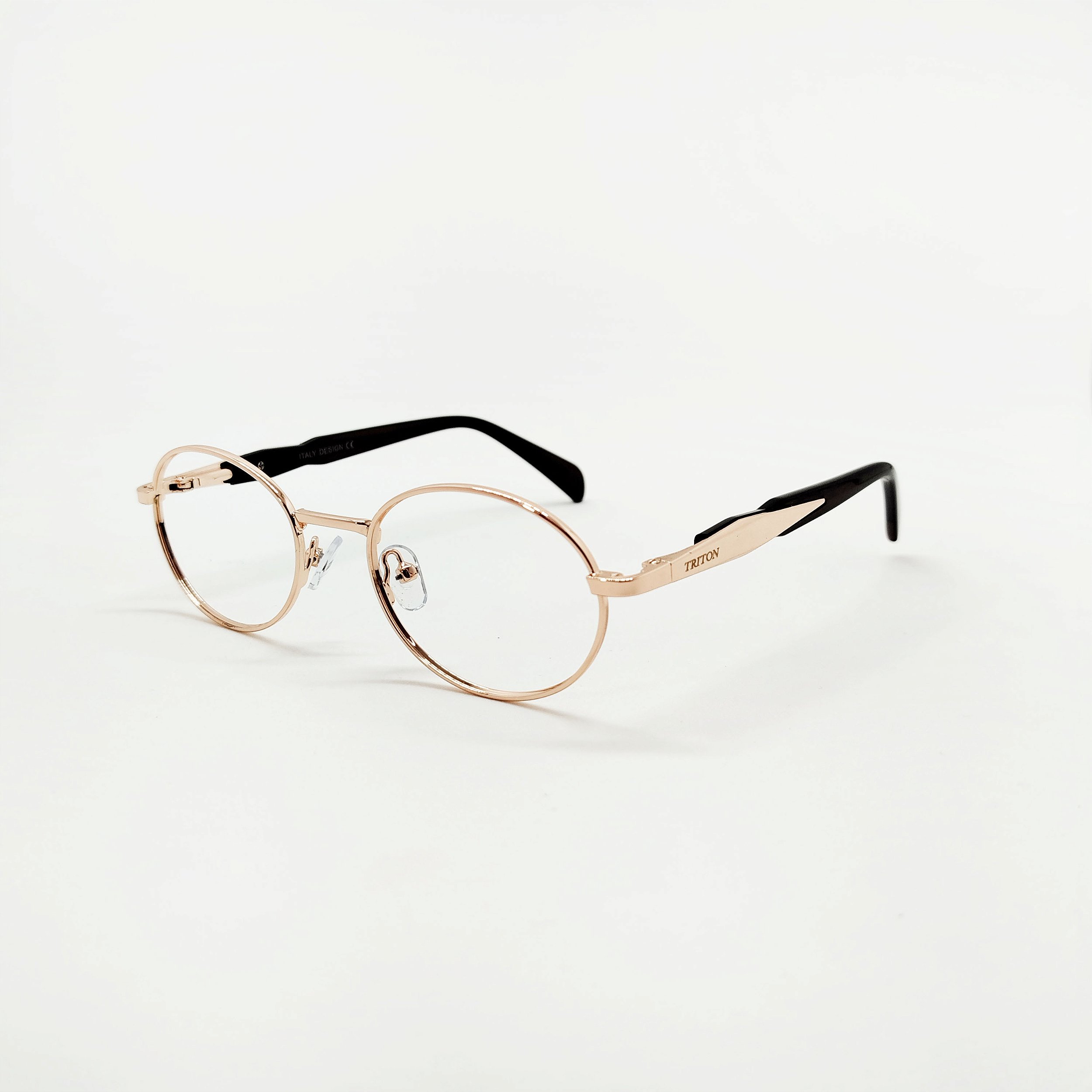Óculos de grau Triton, formato oval na cor rose. Armação em metal, material leve e resistente, proporcionando maior conforto ao usar. As plaquetas em silicone flexíveis podem se ajustar manualmente a diferentes tamanhos e formatos de nariz.