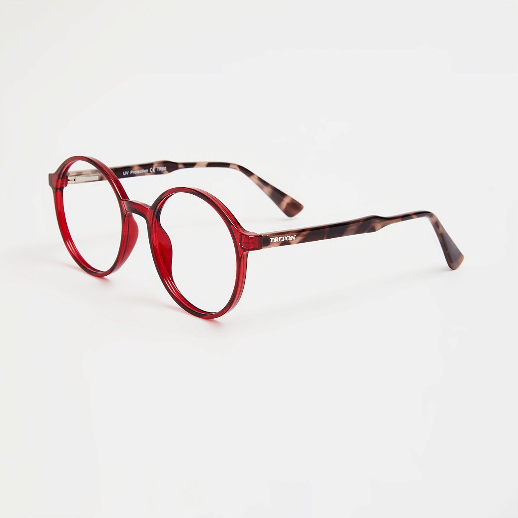 Óculos de grau Triton, formato redondo na cor vermelha. Armação em acetato, material leve e resistente, proporcionando maior conforto ao usar. As plaquetas são embutidas, deixando o visual moderno.