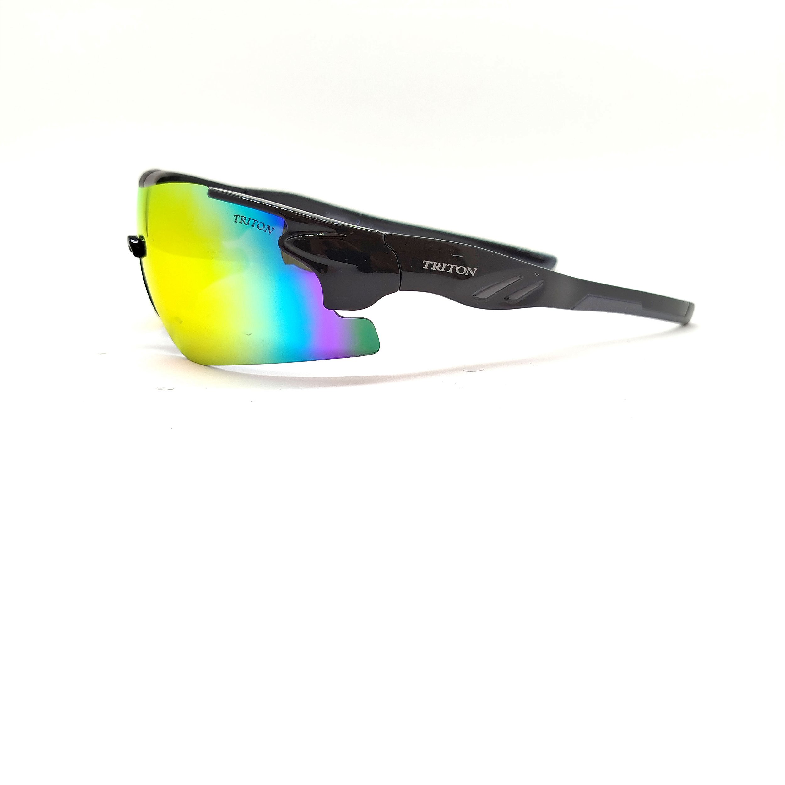 Óculos de sol Triton estilo clássico formato esportivo na cor preta. Armação em acetato e lentes na cor espelhada. As plaquetas são embutidas. As lentes possuem proteção 100% UVA e UVB, protegendo seus olhos contra os raios nocivos do sol e prevenindo o risco de doenças oculares.