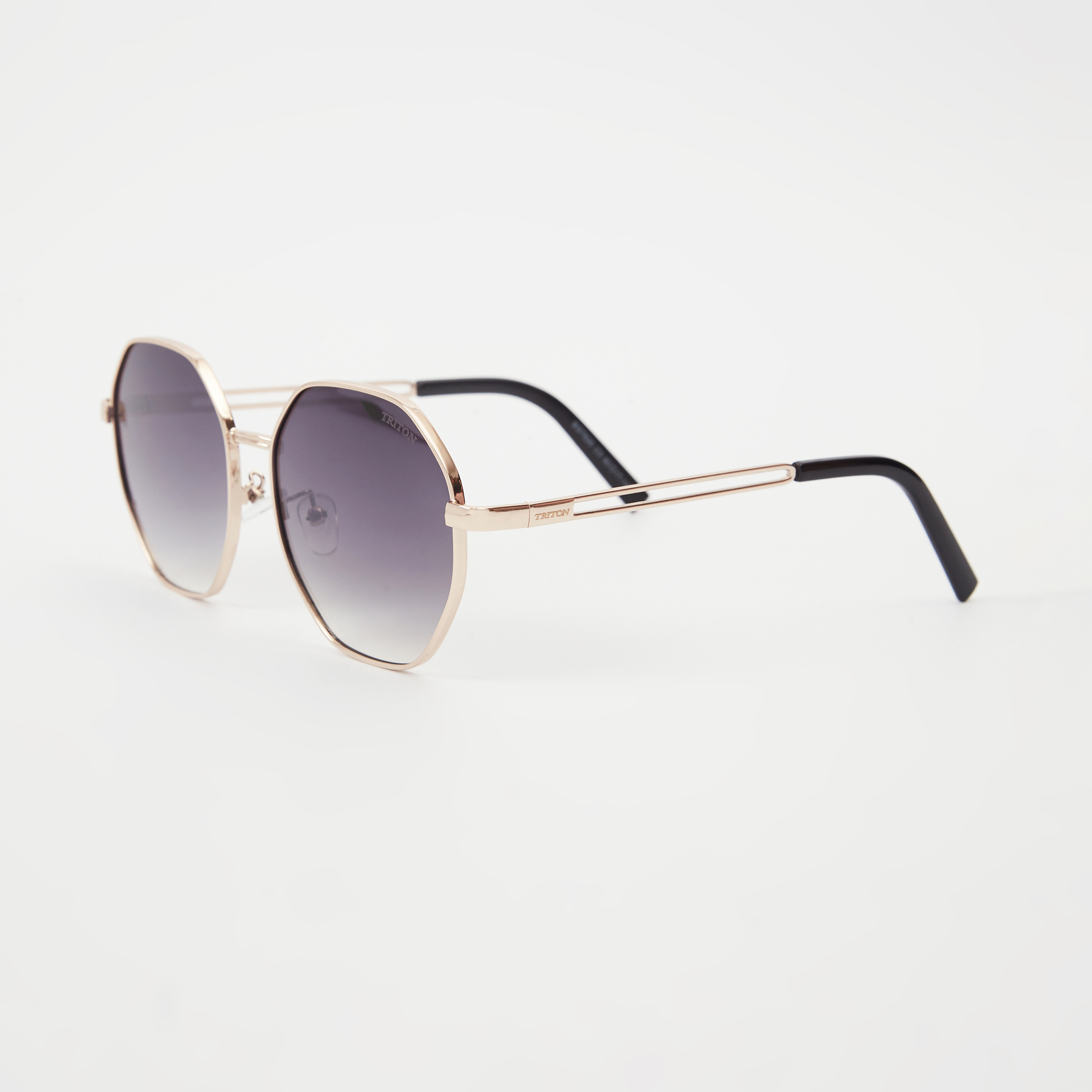 Óculos de sol Triton estilo clássico, formato hexagonal na cor dourada. Armação em metal e lente degradê. As plaquetas em silicone flexíveis podem se ajustar manualmente a diferentes tamanhos e formatos de nariz. Lentes possuem proteção 100% UVA e UVB, protegendo seus olhos contra os raios nocivos do sol e prevenindo o risco de doenças oculares.