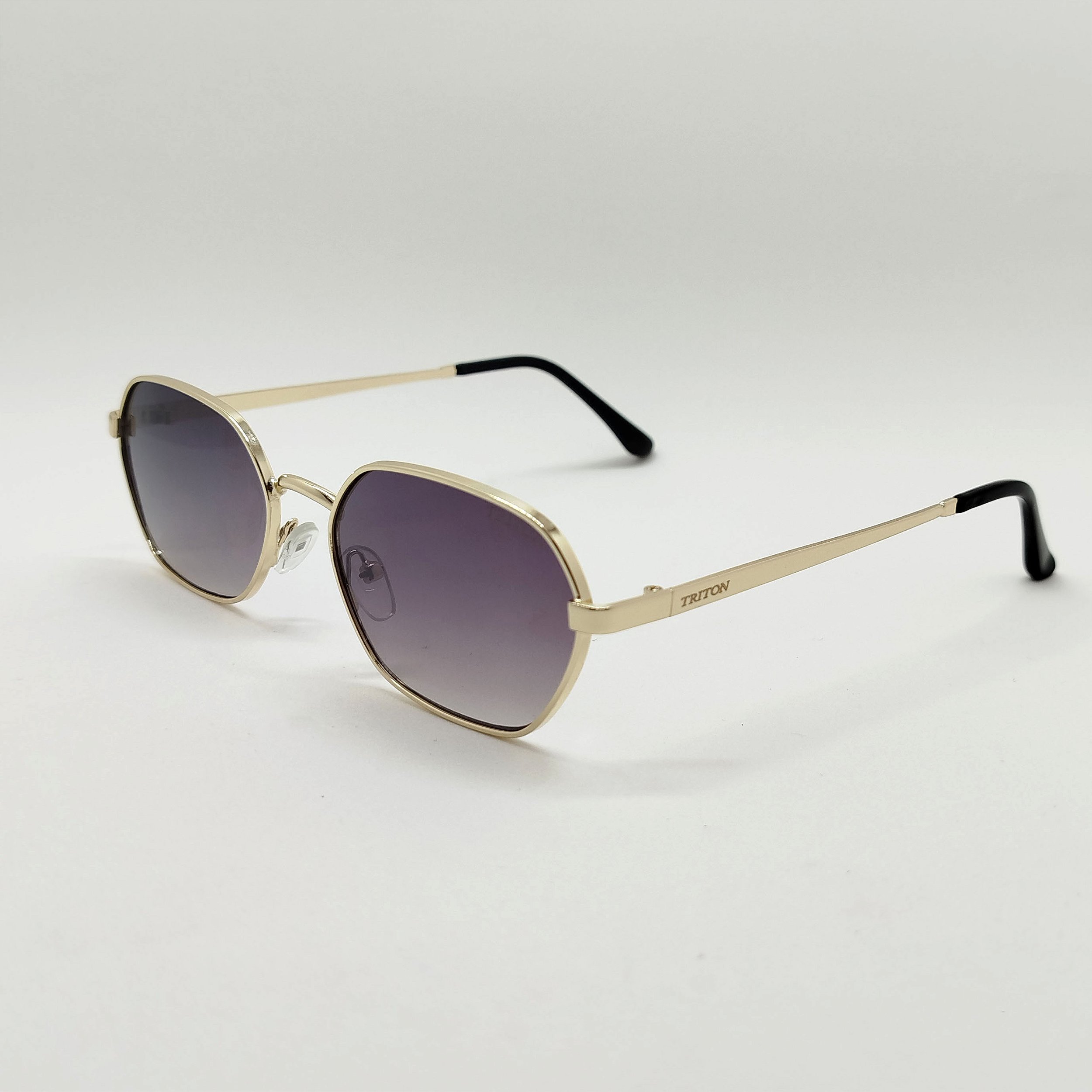 Óculos de sol Triton estilo clássico, formato oval na cor dourada. Armação em metal e lentes na cor fumê degradê. As plaquetas em silicone flexíveis podem se ajustar manualmente a diferentes tamanhos e formatos de nariz. As lentes possuem proteção 100% UVA e UVB, protegendo seus olhos contra os raios nocivos do sol e prevenindo o risco de doenças oculares.